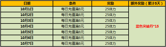 2、玩家在活动期间,累计5天都充值了6元以上的玩家,将额外获得蓝色突破丹15个;