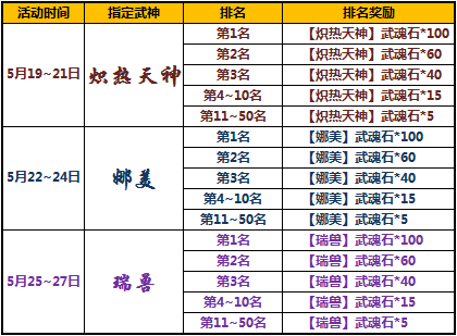 活动期间开启限时指定武魂活动,您在“精彩活动”对应活动界面进行宝藏抽取,即可有几率获得指定武神魂,积分排名1-50名的玩家将有额外排名豪礼相赠。