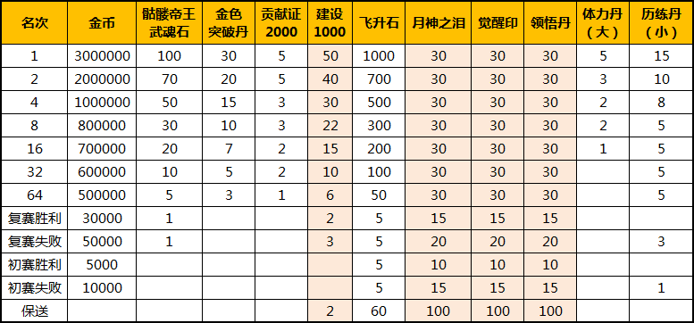 31.优化公会遗迹橙色遗迹的祈福奖励:取消时装,并将时装移到公会商店,同时替换为领悟丹和觉醒印(20个)