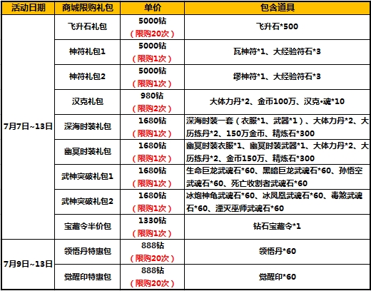 1、活动时间,礼包将在游戏商城的道具柜面出售,请注意活动范围及限购次数;