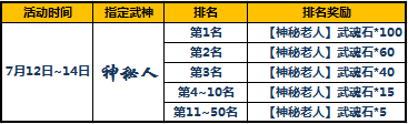 活动期间开启限时指定武魂活动,您在“精彩活动”对应活动界面进行宝藏抽取,即可有几率获得指定武神魂,积分排名1-50名的玩家将有额外排名豪礼相赠。