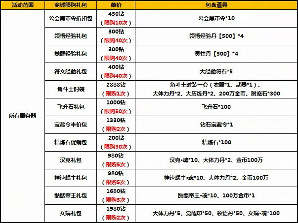 1、活动时间,礼包将在游戏商城的道具柜面出售,请注意活动范围及限购次数;