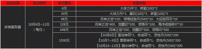 举例:活动期间单日累计充值满30元,即可领取6元档次充值奖励和30元档次充值奖励。