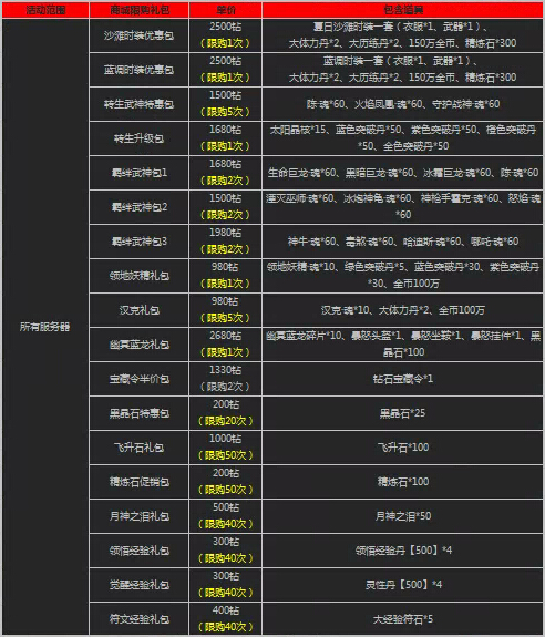 1、活动时间,礼包将在游戏商城的道具柜面出售,请注意活动范围及限购次数;