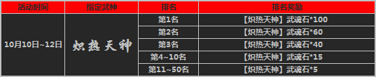 活动期间开启限时指定武魂活动,您在“精彩活动”对应活动界面进行宝藏抽取,即可有几率获得指定武神魂,积分排名1-50名的玩家将有额外排名豪礼相赠。