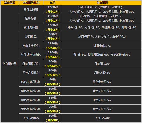 1、活动时间,礼包将在游戏商城的道具柜面出售,请注意活动范围及限购次数;