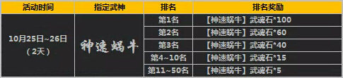 活动期间开启限时指定武魂活动,您在“精彩活动”对应活动界面进行宝藏抽取,即可有几率获得指定武神魂,积分排名1-50名且积分大于等280点的玩家将有额外排名好礼相赠。