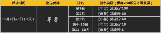 活动期间开启限时指定武魂活动,您在“精彩活动”对应活动界面进行宝藏抽取,即可有几率获得指定武神魂,积分排名1-50名且积分大于等280点的玩家将有额外排名奖励。