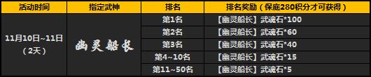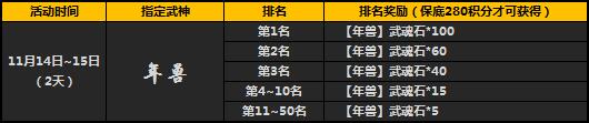 活动期间开启限时指定武魂活动,您在“精彩活动”对应活动界面进行宝藏抽取,即可有几率获得指定武神魂,积分排名1-50名且积分大于等280点的玩家将有排名好礼相赠。