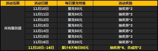 2、活动期间只需累计6天每日充值达到50元,即可领取:抽奖券*6、合成符*2;