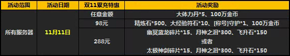 活动期间累计充值金额达到对应金额,即可免费获得官方赠送的游戏好礼!双十一超值特惠,千万不要错过哦!