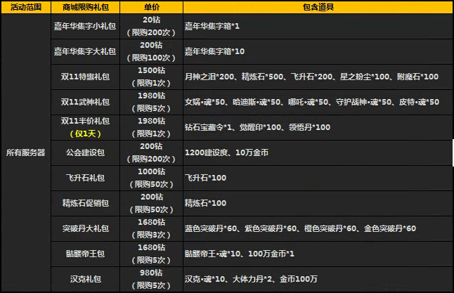 1、活动时间,礼包将在游戏商城的道具柜面出售,请注意活动范围及限购次数;