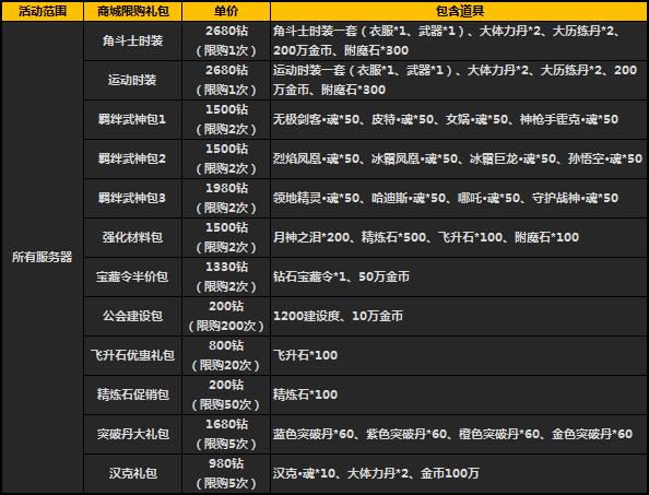1、活动时间,礼包将在游戏商城的道具柜面出售,请注意活动范围及限购次数;