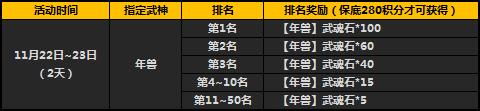活动期间开启限时指定武魂活动,您在“精彩活动”对应活动界面进行宝藏抽取,即可有几率获得指定武神魂,积分排名1-50名的玩家将有额外排名豪礼相赠。