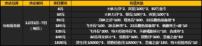 举例:活动期间单日累计充值满30元,即可领取6元档次充值奖励和30元档次充值奖励。