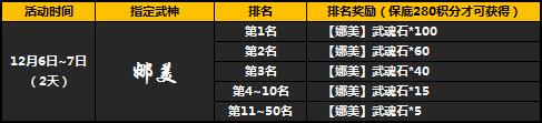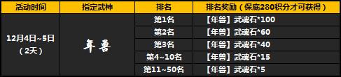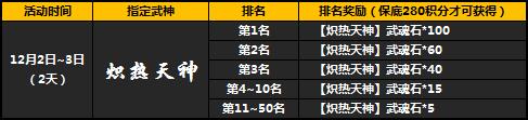 活动期间开启限时指定武魂活动,您在“精彩活动”对应活动界面进行宝藏抽取,即可有几率获得指定武神魂,积分排名1-50名且积分大于等280点的玩家将有额外排名豪礼相赠。